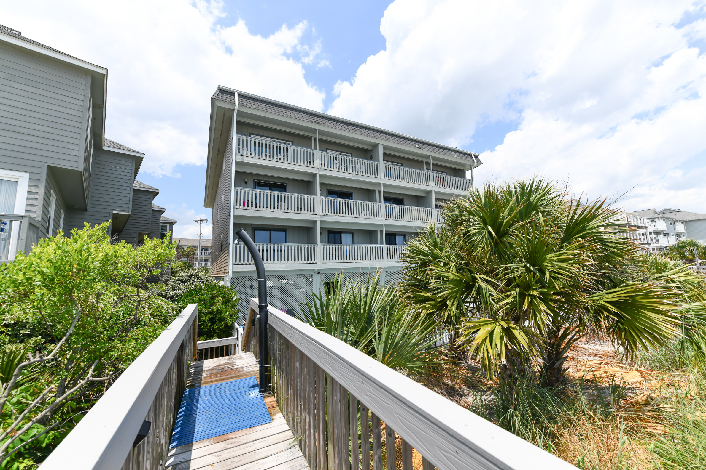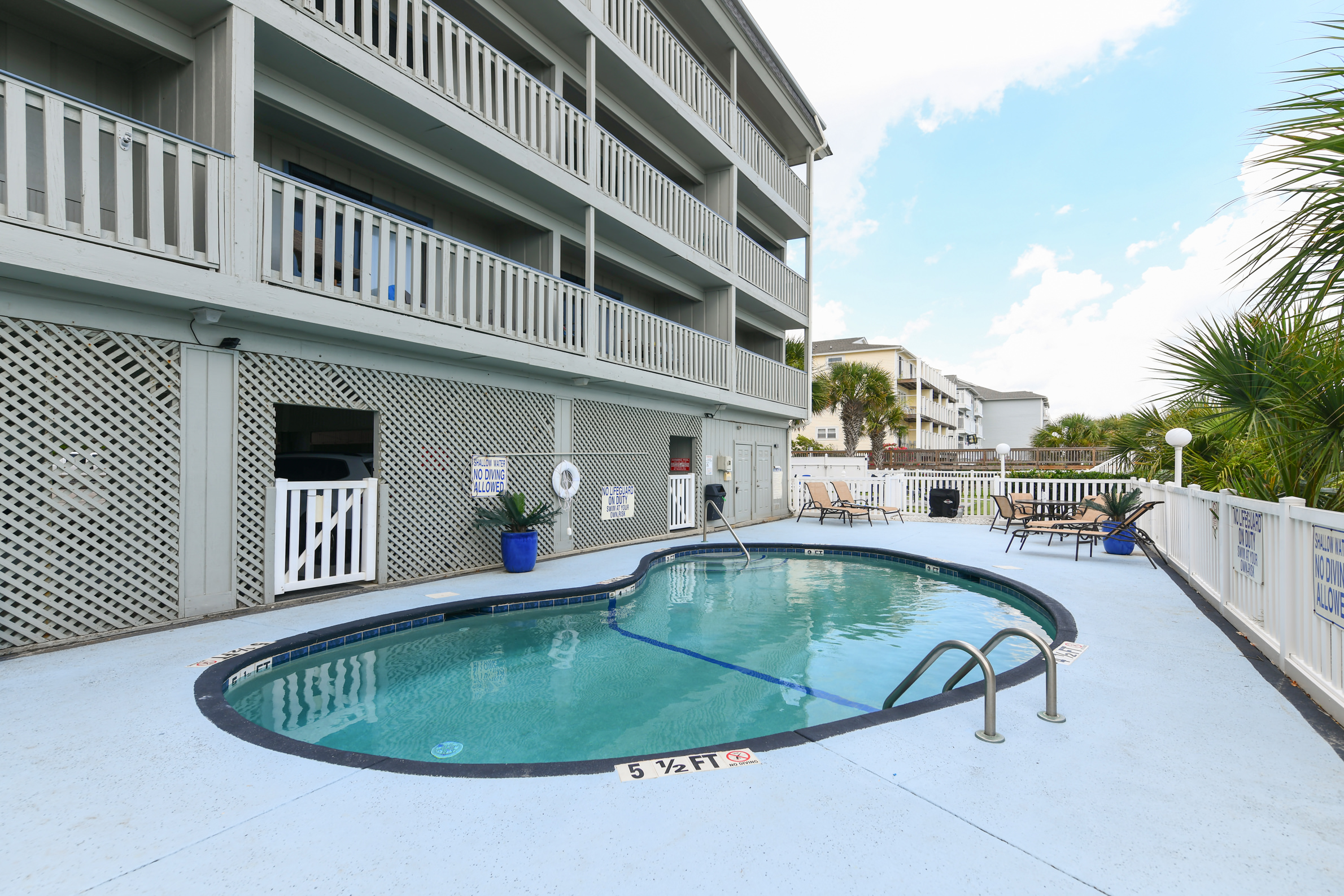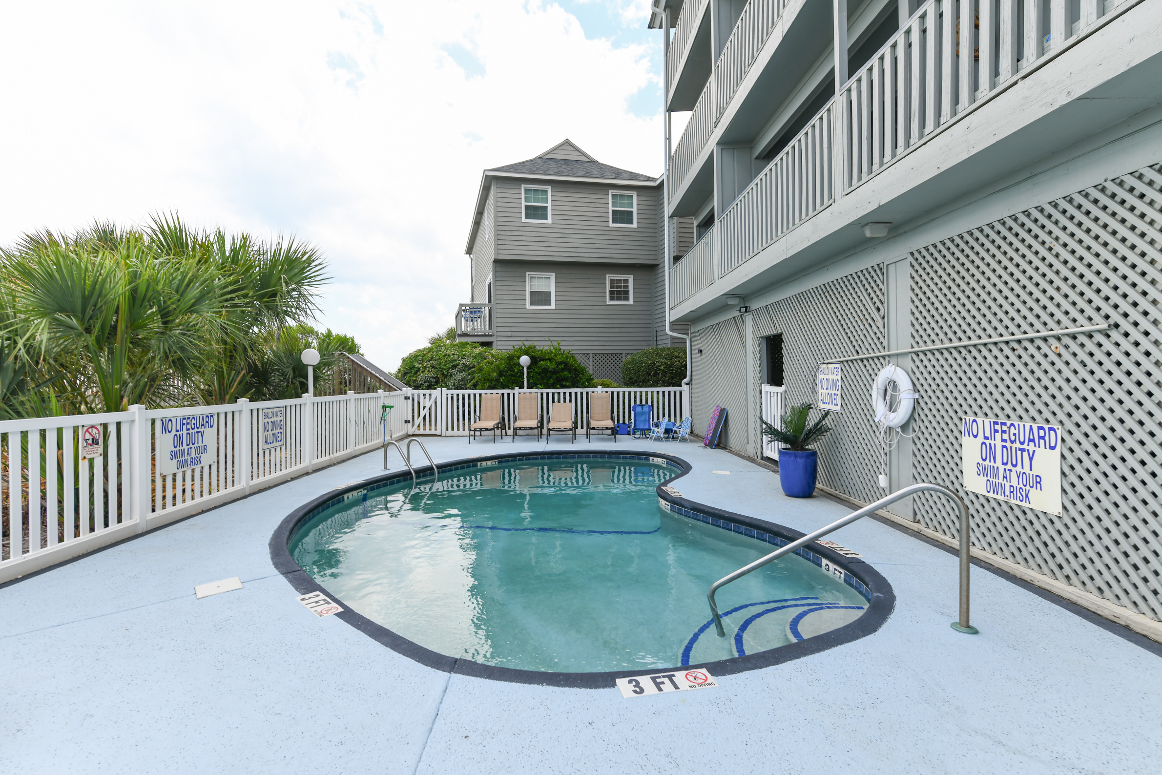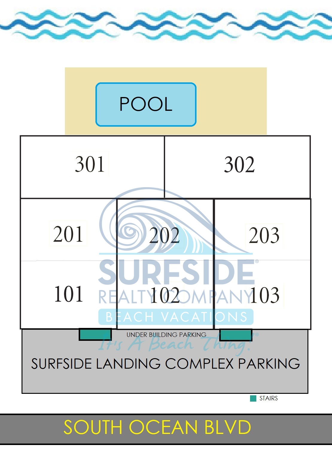 Surfside Landing is an oceanfront complex offering all oceanfront condos, oceanside swimming pool, elevator, accommodating 6-8 with 2-4 bedrooms and 2-3 baths. Each condo features central HVAC, all-electric kitchen, living-dining area, wireless internet, cable TV, washer/dryer, dishwasher, microwave and private balcony. No pets are allowed. No golf Carts are permitted.