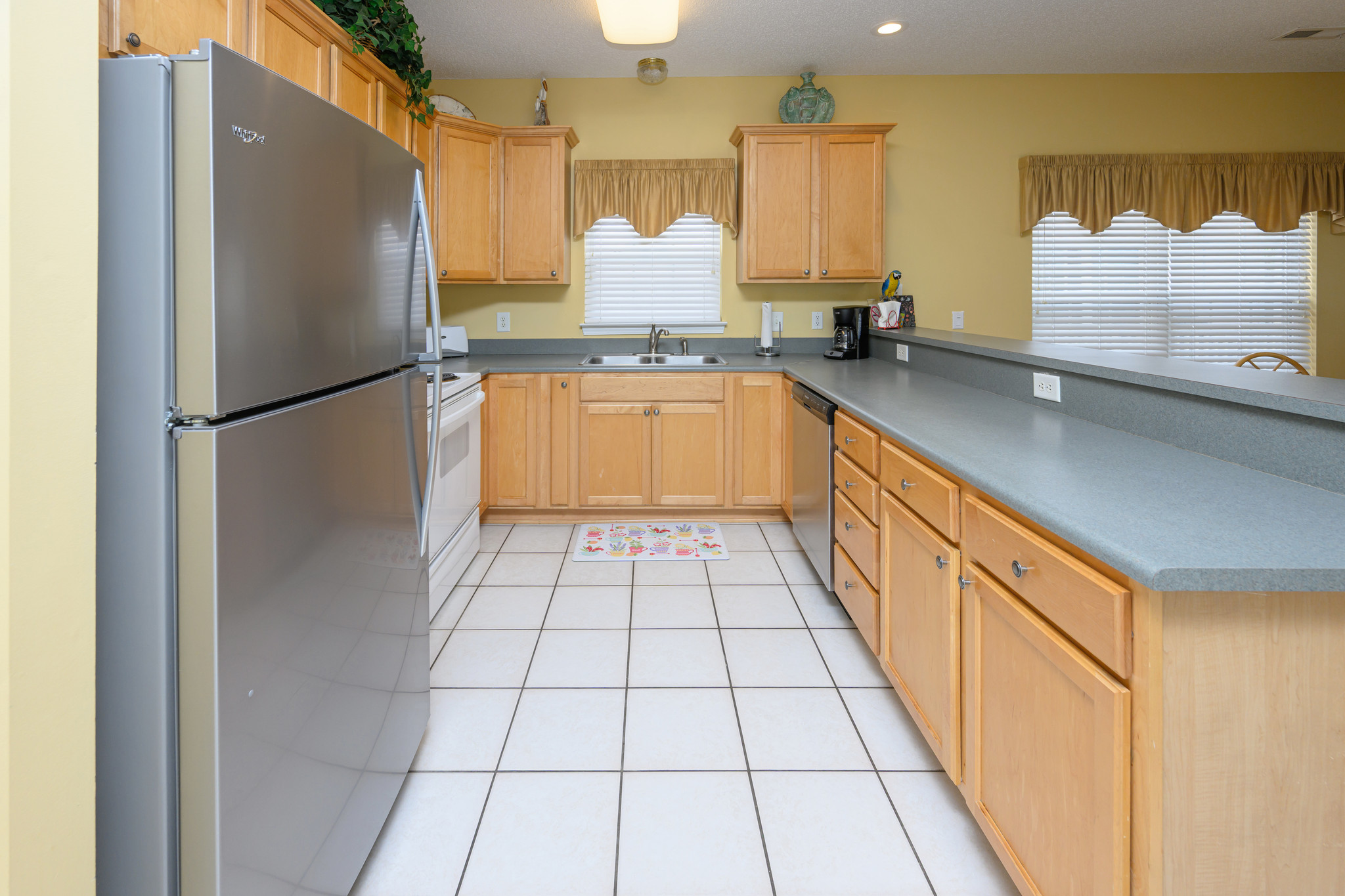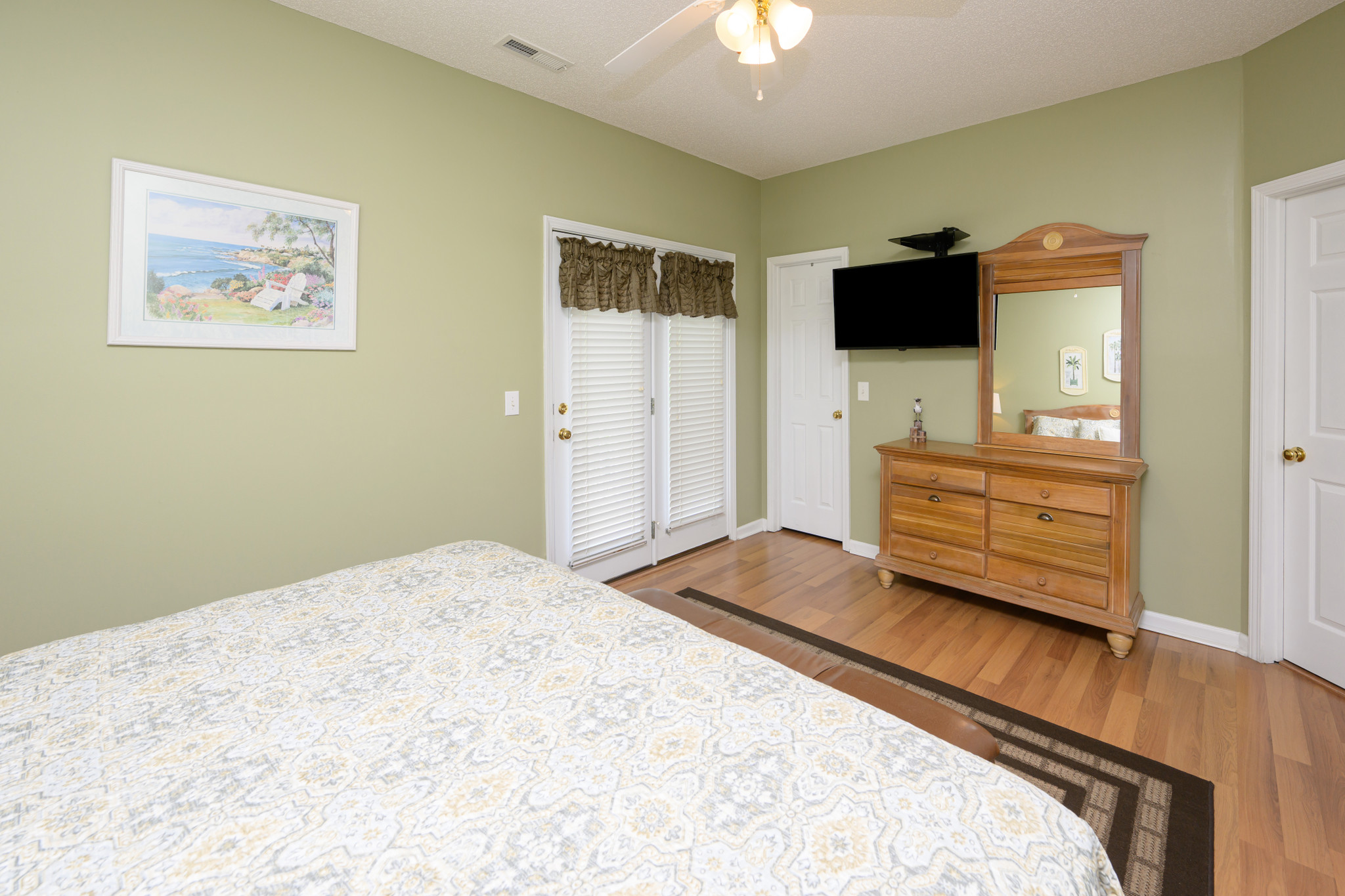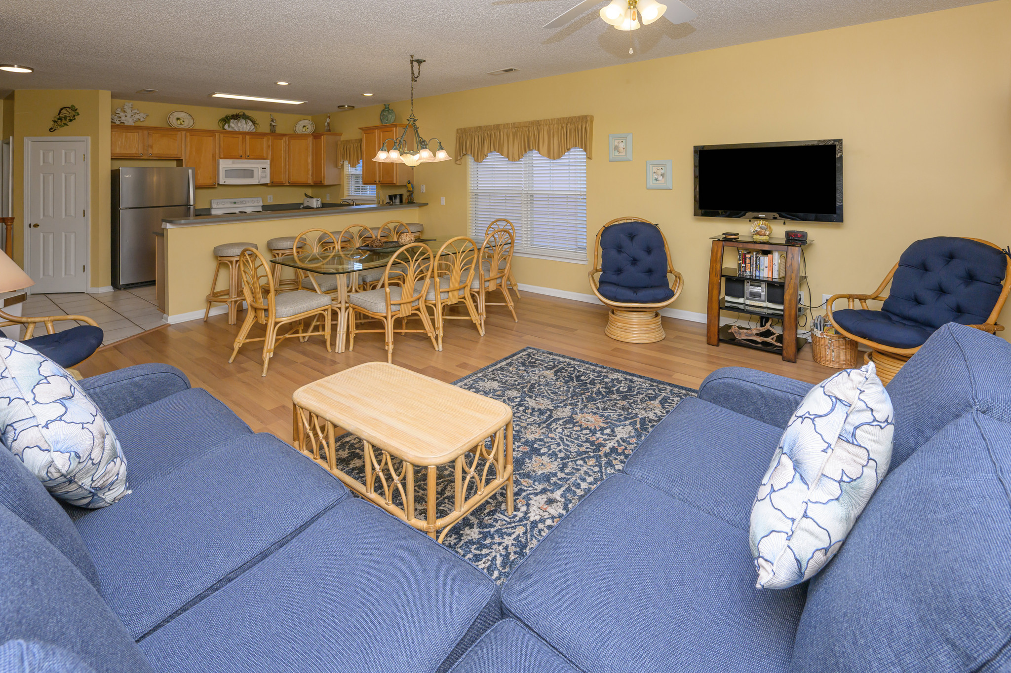 Internet, Televisions (streaming available), Heat & Central A/C, Ceiling Fans, Washer & Dryer, Range & Oven, Microwave, Refrigerator, Dishwasher, Basic Kitchen Amenities. There are ceiling fans in the living room and every bedroom. All bedding will have a mattress cover, pillows and comforter or bedspread. We also provide a small bar of soap at each sink, one roll of toilet paper in each bathroom, and a trash bag in each trashcan. Guests should be prepared to provide any of these items as needed beyond what we supply. Guests are also responsible for providing detergents, spices, salt & pepper, sugar, etc as needed.