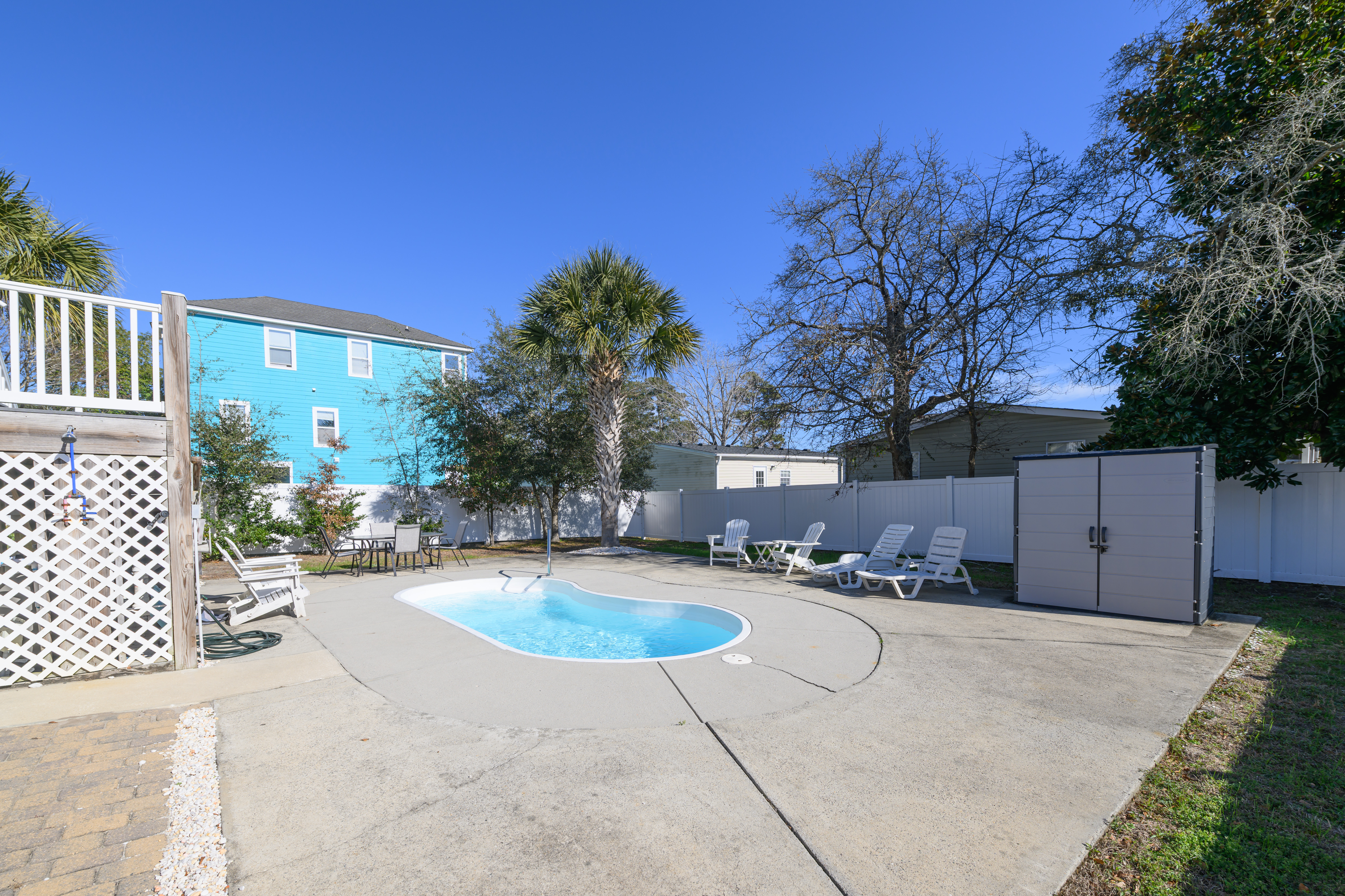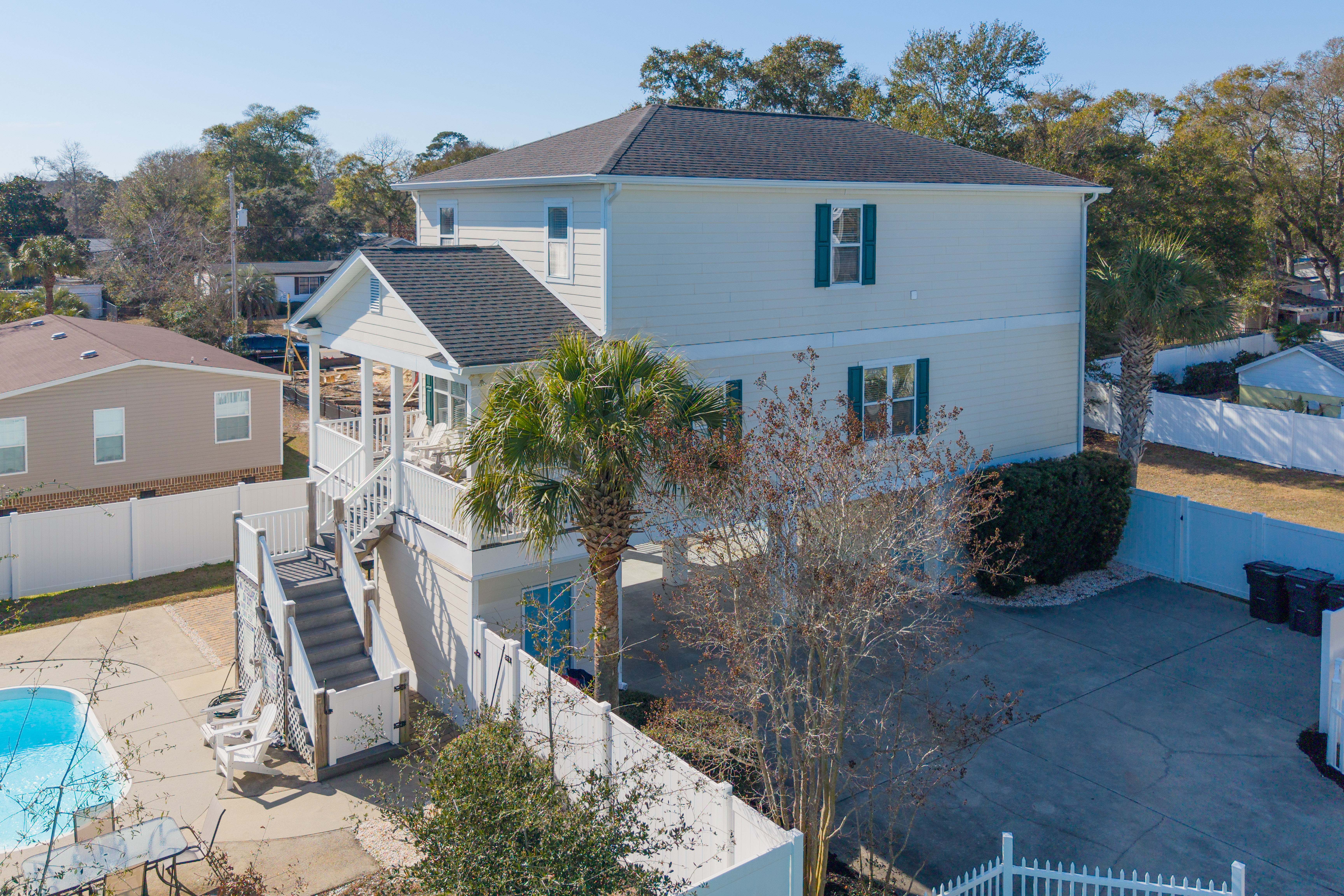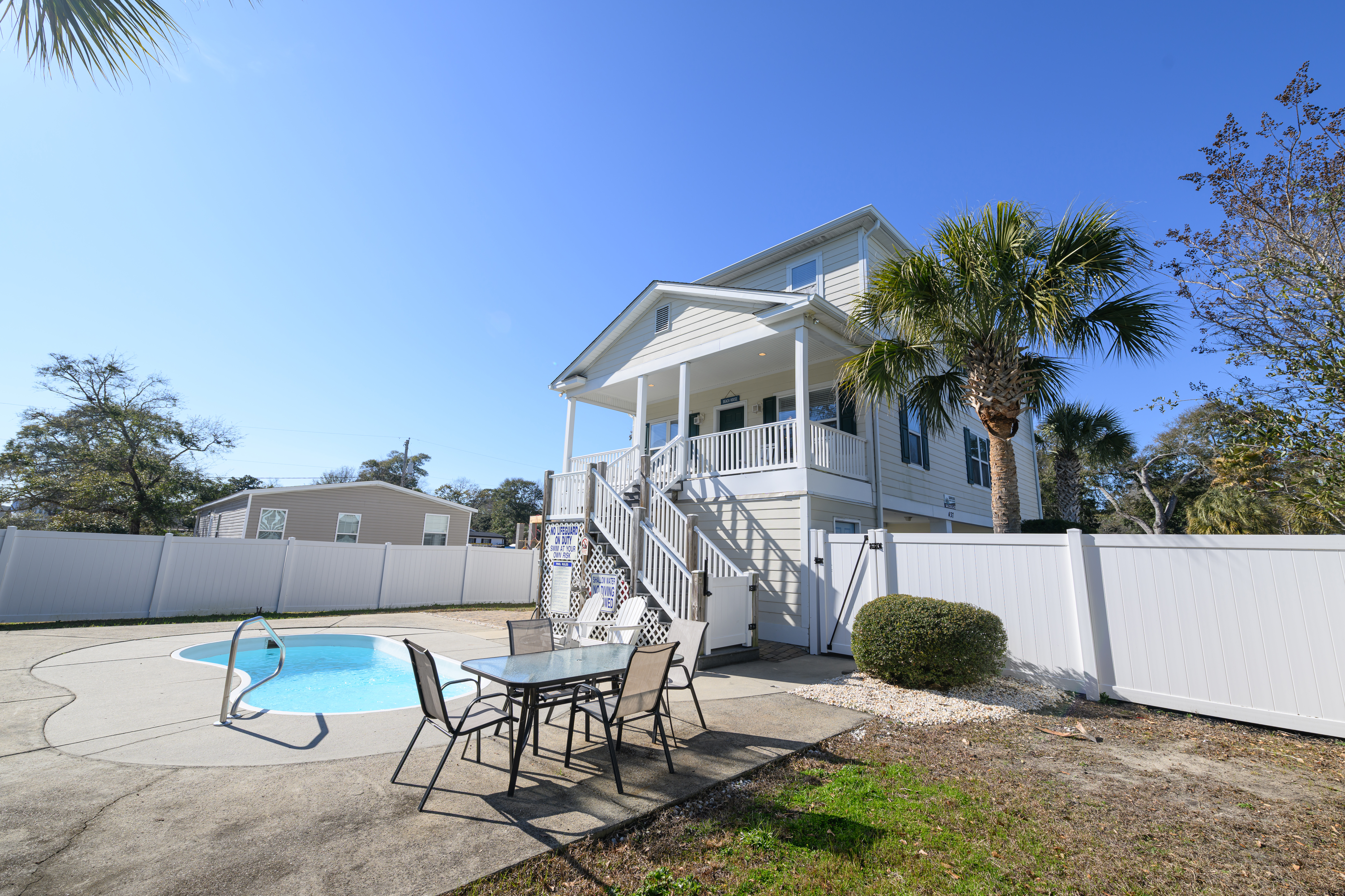Private Pool - Professionally Maintained, Outdoor Shower (Hot and Cold), Covered Exterior Porch, Paved Covered & Uncovered Parking, Owner-Provided Charcoal Grill (Guest is Responsible for Cleaning Between Every Use & Supplies/Charcoal Refills) - Not Professionally Maintained, Professionally Landscaped Grounds, Non Smoking Environment, Pet Friendly (50 lb Limit, Max 2 Dogs, Additional Fees Apply). This property has three exterior surveillance cameras located in the carport overlooking the driveway, entrance to the backyard, and side yard.